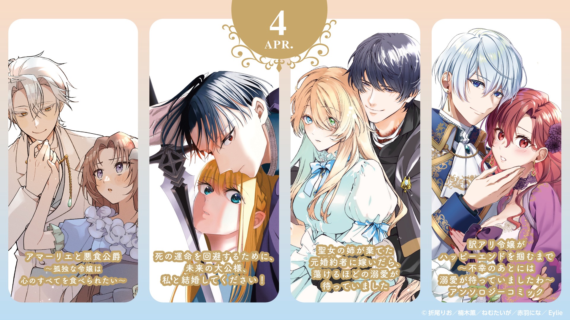NEWS 〈新着情報〉2026年4月配信のお知らせ2026年4月1日Etc.2026年3月配信のお知らせ2026年3月1日Etc.2026年2月配信のお知らせ2026年2月1日Etc.2026年1月配信のお知らせ2026年1月1日Etc.TITLE 〈作品〉試し読み聖女の姉が棄てた元婚約者に嫁いだら、蕩けるほどの溺愛が待っていました漫画:ねむたいが試し読み死の運命を回避するために、未来の大公様、私と結婚してください!漫画:楠木薫試し読みアマーリエと悪食公爵~孤独な令嬢は心のすべてを食べられたい~漫画:折尾りお試し読み死に戻り先で魔術の先生に溺愛されています漫画:燈火ANTHOLOGY 〈アンソロジー〉試し読み訳アリ令嬢がハッピーエンドを掴むまで~不幸のあとには溺愛が待っていましたわ~アンソロジーコミック(1)試し読み死に戻り令嬢は次こそ幸せを諦めない~運命はこの手で掴んでみせますわ〜(1)COMICS 〈単行本〉試し読みコミックス準備中!Eylie編集部NOVELS 〈小説〉試し読みNOVELS準備中!Eylie編集部 SNS Tweets by Eylie